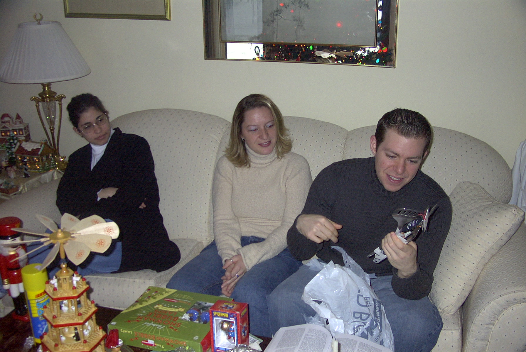 Opening presents Christmas morning 2003 at the Jared Johnson home in Grand Rapids, Michigan. Jeannette Johnson, Heather Jones, and Ross Johnson.