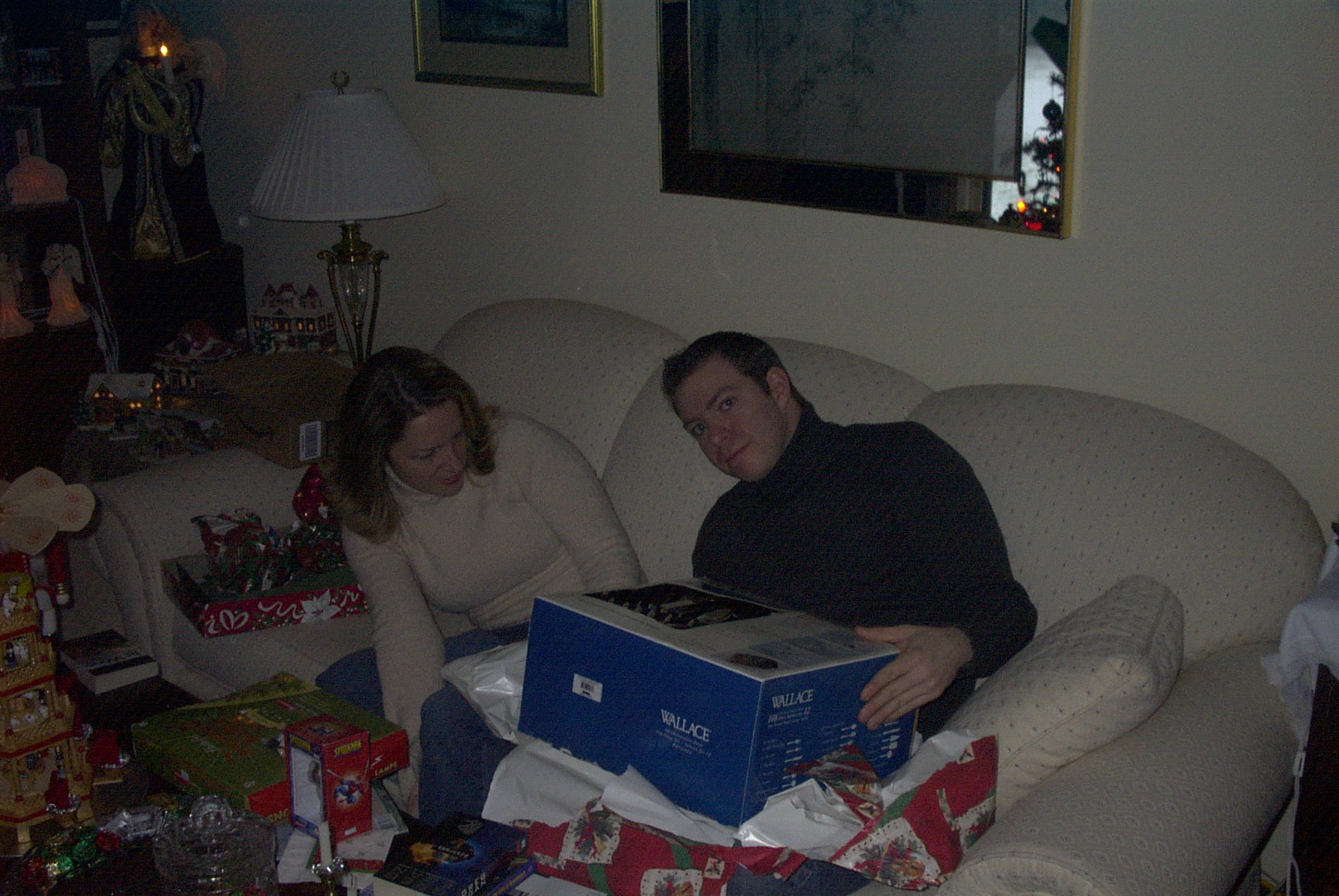 Christmas present opening 2003 , Heather Jones, and Ross Johnson at home of Jared Johnson in Grand Rapids, Mi
